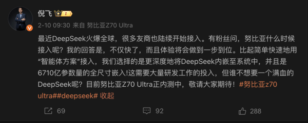 倪飞认为,努比亚并非直接装载一个满血版DeepSeek大模型,而是通过内嵌的方式,与自家的星云智能其他多模态能力进行交互,提升综合体验。他在采访中更是直言:“内嵌全尺寸模型后,入口一体化、操作更人性化。用户无需在不同AI界面间来回切换,这才是真正的智能体验。”