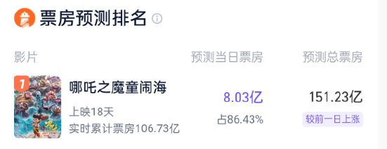 《哪吒之魔童闹海》的奇迹还在上演,据灯塔专业版AI票房预测显示,其总票房预测已经上涨至151.23亿。