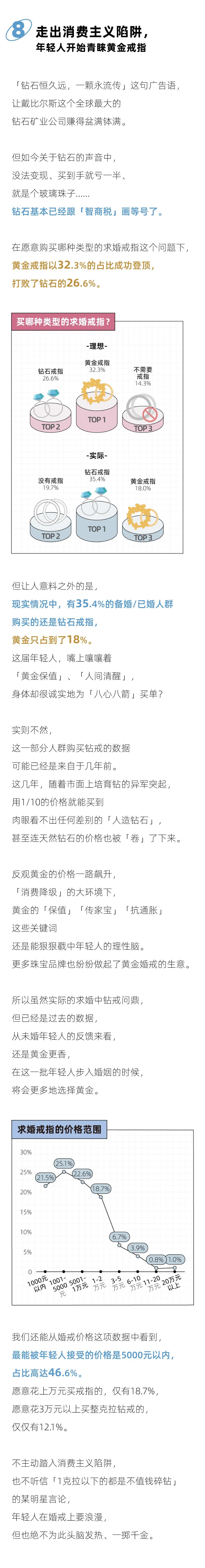 在现实的生活中,很多年轻人已经不在意彩礼、嫁妆那一套,婚房也不是某一方担起的责任,「一克拉以下的钻石是不值钱的碎钻」只是当做段子说说,很多人都觉得黄金戒指更好。