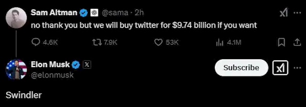 没想到,此番言论迅速引来了马斯克的直接反击,他在同一平台上直接称呼奥尔特曼为“骗子”,为这场收购风波再添了一把火。