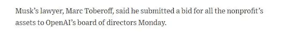 据马斯克的律师托贝罗夫称,已向OpenAI董事会提交了该收购要约。