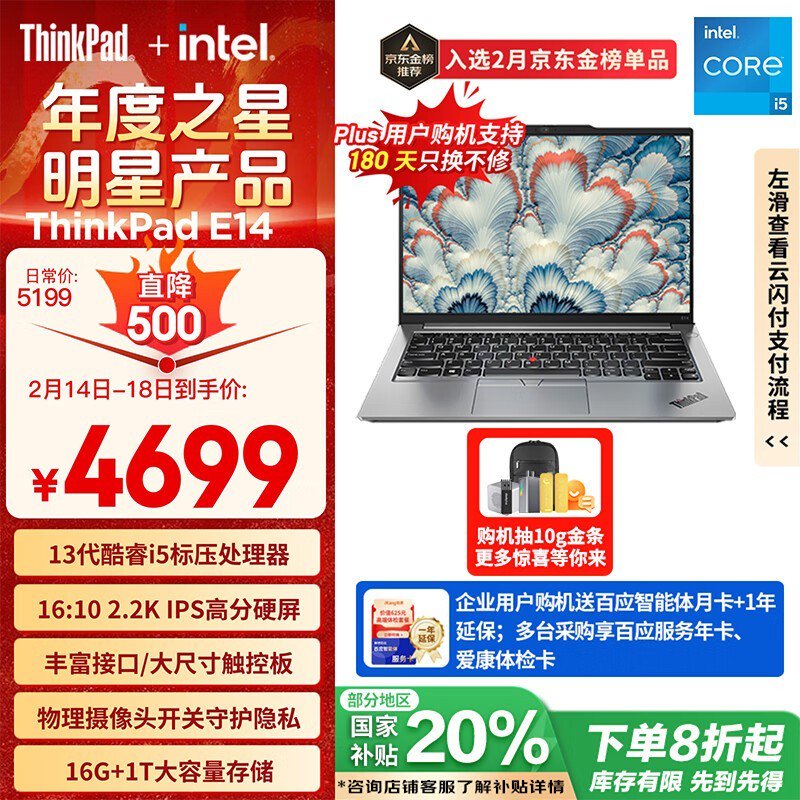 联想ThinkPad E14 2023款轻薄办公电脑促销价3732元!