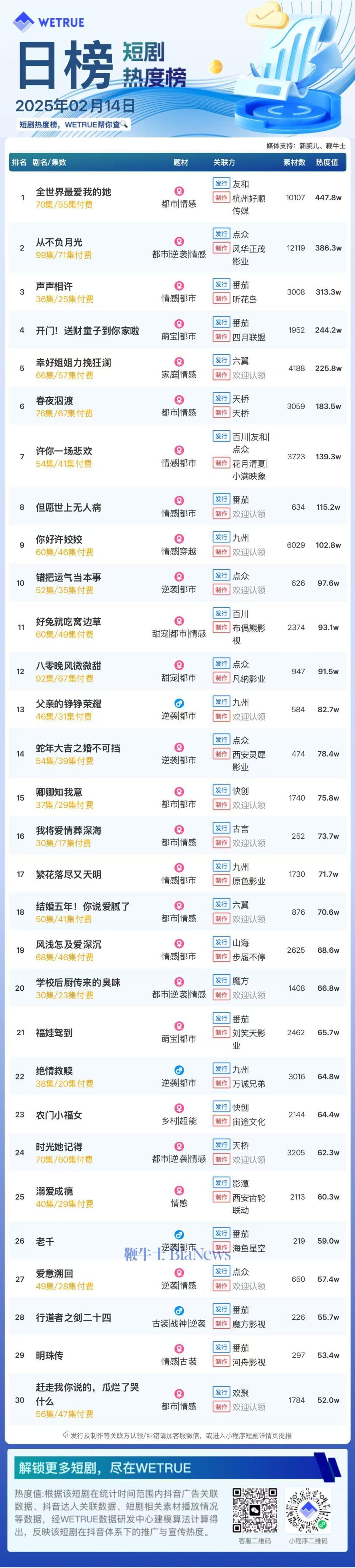 编者按:为帮助短剧从业者提供更多信息,专注于短剧报道的新腕儿和科技媒体鞭牛士联合WETRUE短剧热度榜共同推出短剧热度榜。