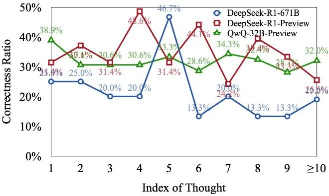为了验证模型回答中的初步想法是否正确,下图展示了在错误回答中不同位置思路的正确比例。