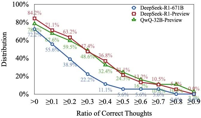 观察发现,超过 70% 的错误回答中至少包含一个正确的思路。此外,在这些回答中,有超过 50% 的回答其正确思路的比例达到 10% 以上。这表明,虽然长推理模型能够成功找到正确的推理思路,但它们往往难以沿着这些路径持续深入,进而得出正确的结论。这一现象凸显了鼓励模型保持并拓展其最初正确思路的重要性,以便将这些正确思路整合为准确的最终答案。