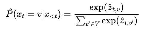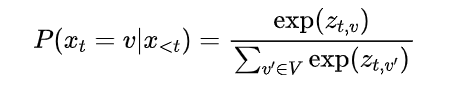 在标准的解码过程中,在位置 t 生成 token v 的概率是通过对输出层的 logits 使用 softmax 函数计算的: