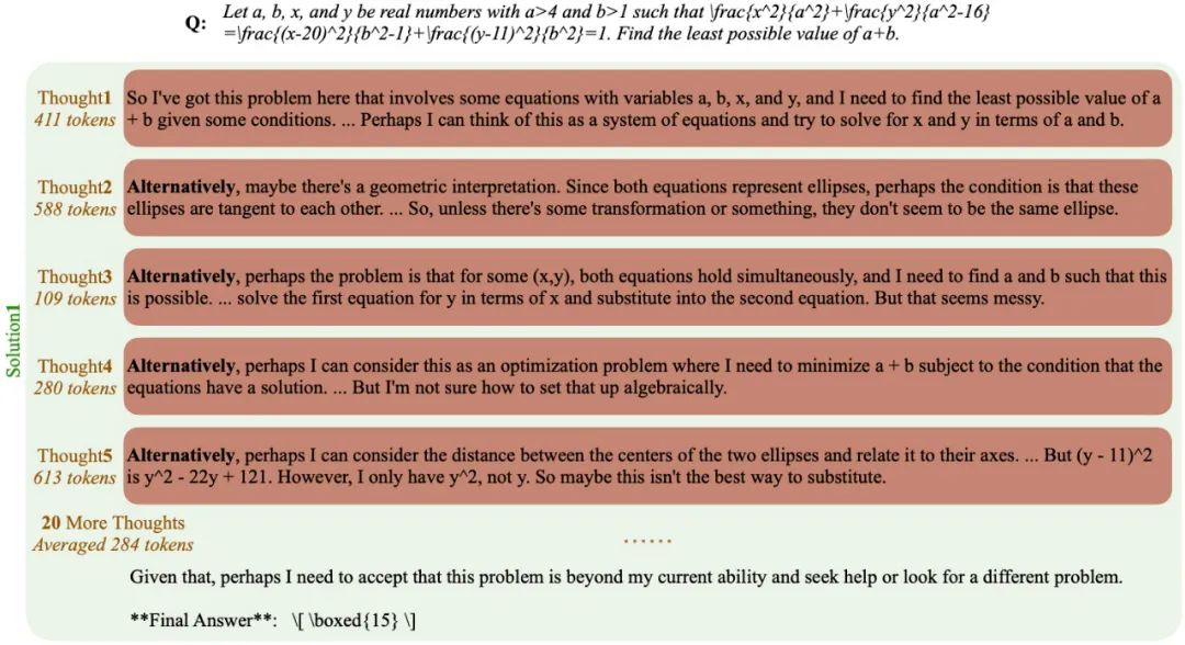研究团队的最新研究显示,长推理模型在推理过程中往往频繁地进行思路跳转,无法将注意力集中在一个正确的思路上并深入思考,从而得到正确答案。研究团队首先将 “思路(thought)” 定义为模型在推理策略中产生的中间认知步骤。长推理模型常常通过使用 “alternatively” 等术语来切换推理思路。例如,在下图所示的例子中,模型可能会从代数操作转向几何解释,再到优化策略。这种思路切换使得长推理模型能够更广泛地探索潜在的解决方案,展示了其在解决复杂问题时的灵活性。