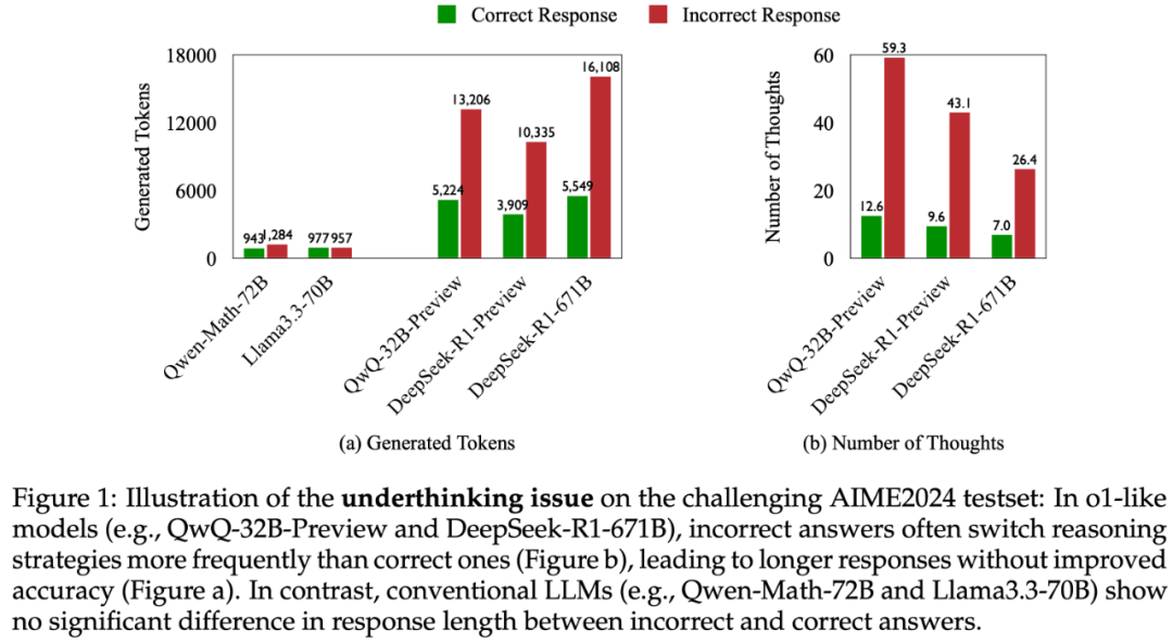 研究团队认为,频繁切换思路而得出错误答案的行为,可能源于以下两个原因:一是真正的思考不足,即模型虽然找到了一条有希望的思路,但未能持续深入地坚持下去;二是对问题缺乏深入理解,从而盲目探索各种无效的方法。