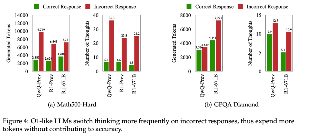 ,表示模型对该问题缺乏理解,因此无法认为是 “思考不足”。直观地说,如果一个模型在回答过程中最初产生了正确的思路,但随后转向其他思路并最终未能得出正确答案,那么此后生成的 token 对于最终达到正确答案并无实质性贡献。这种情况下,由于缺乏足够的思考深度,模型的推理过程被认为是低效的。具体而言,