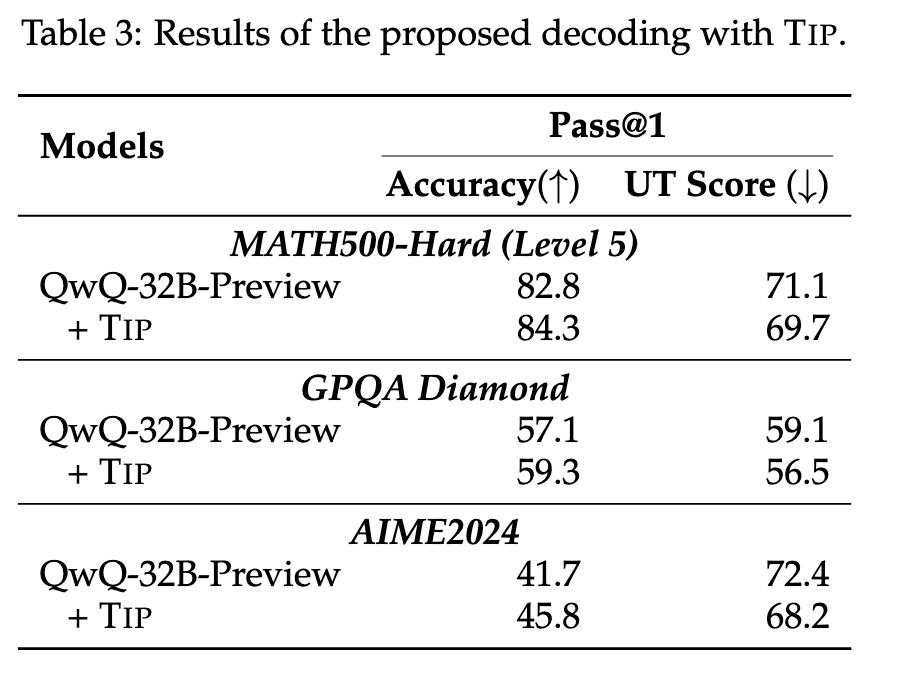 结果显示,通过引入 TIP 策略,即使不进行模型微调也能在 MATH500-Hard、GPQA Diamond 和 AIME2024 上获得准确率提升并减少思考不足。