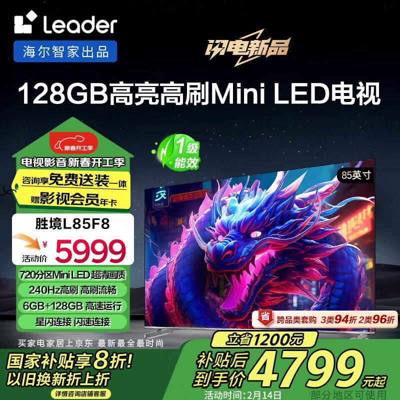 海尔统帅L85F8 Leader:16:9超清Mini-LED智屏,5999元享沉浸式家庭影院体验