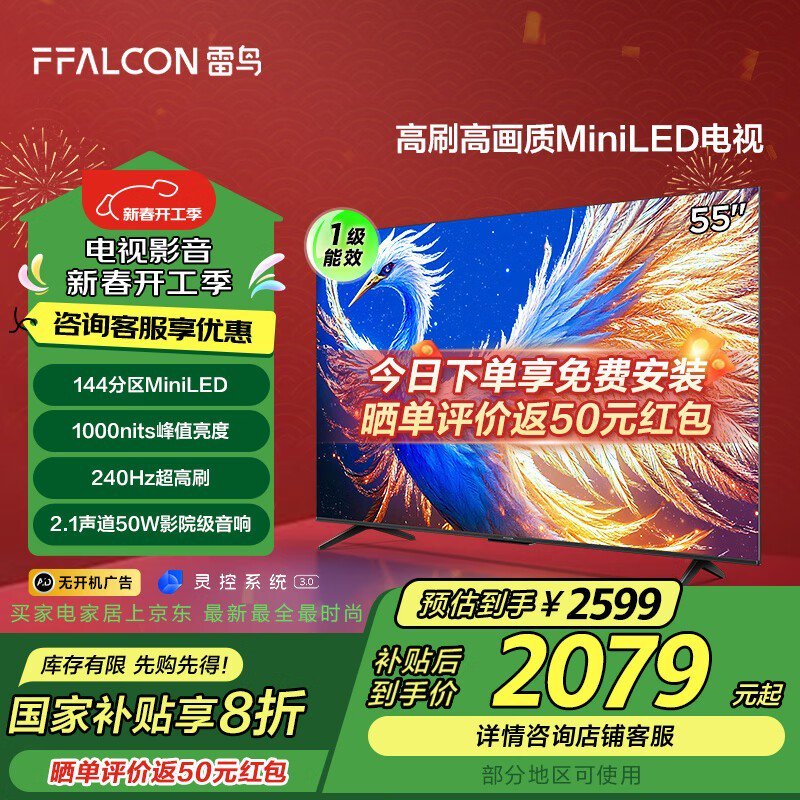 2025年FFALCON雷鸟鹤6 55英寸MiniLED电视:16:9高画质,4核CPU+TCL智能语音,仅售2599元