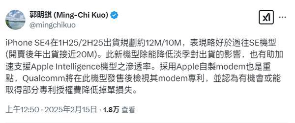 知名分析师郭明錤最新发文称,预计iPhone SE 4今年出货近2000万台,成为史上最强的SE系列机型。