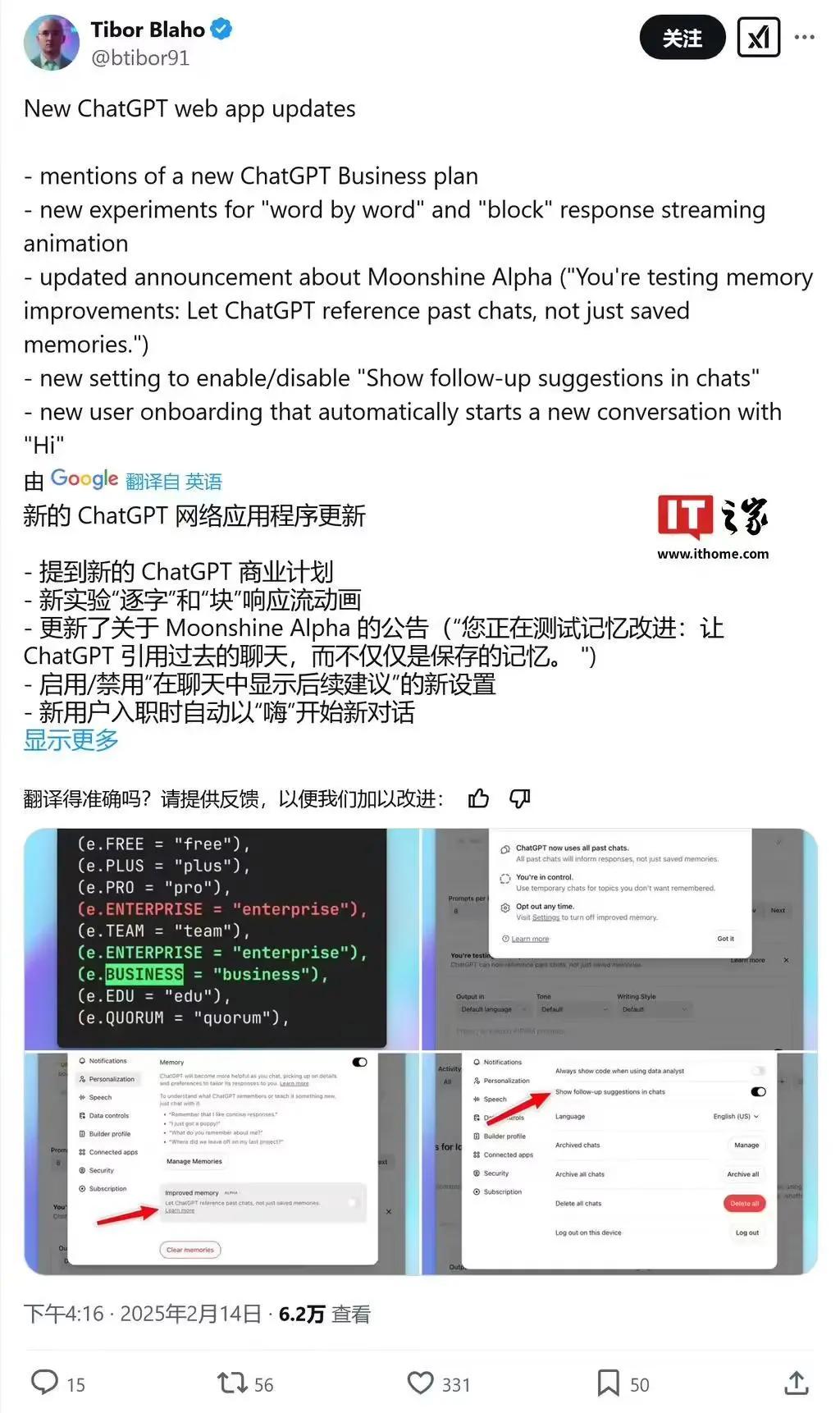 2 月 15 日消息,科技媒体 testingcatalog 昨日(2 月 14 日)发布博文,报道称继谷歌 Gemini 上线“全局记忆”功能之后,OpenAI 也在增强 ChatGPT 的记忆功能,内部代号为“Moonshine”。