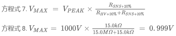 对于 1000V 器件:RHV = 12.5MΩ;RSNS = 12.5kΩ。集成电阻容差为 ±20%。高压和低压电阻 RHV 和 RSNS 朝相同方向漂移。SNSP 引脚上的标称电阻分压器电压: