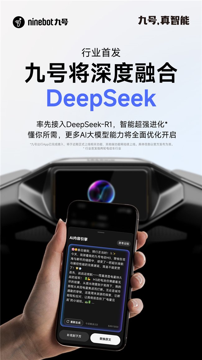 通过接入DeepSeek-R1,九号出行App将大幅提升用户图文创作能力、数据分析、个性化推荐、智能服务等功能,为用户更好地提供车辆控制、出行建议、个性化推荐及售后等服务。DeepSeek强大的AI大模型能力将全方位优化用户体验,进一步拓宽人工智能在两轮电动车领域的应用边界。