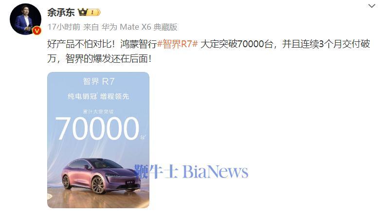 智界R7累计大定破7万台,余承东称爆发还在后面