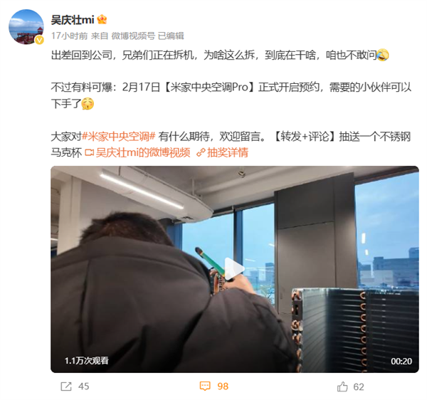 快科技2月16日消息,日前,小米集团大家电部家中空调研发负责人吴庆壮在微博透露,米家中央空调Pro将于2月17日正式开启预约,预计将在2月底举办的小米15 Ultra、小米SU7 Ultra发布会上同台登场。