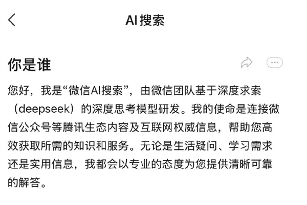 微信AI搜索自我介绍显示为基于深度求索(DeepSeek)的深度思考模型研发,使命是连接微信公众号等腾讯生态内容及互联网权威信息,帮助用户高效获取所需的知识和服务。