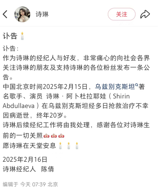 快科技2月16日消息,据媒体报道,今日,诗琳经纪人在社交平台发布讣告称,2月15日,乌兹别克斯坦著名的歌手、演员诗琳·阿卜杜拉耶娃(Shirin Abdullaeva)在乌兹别克斯坦因病离世,年仅20岁。