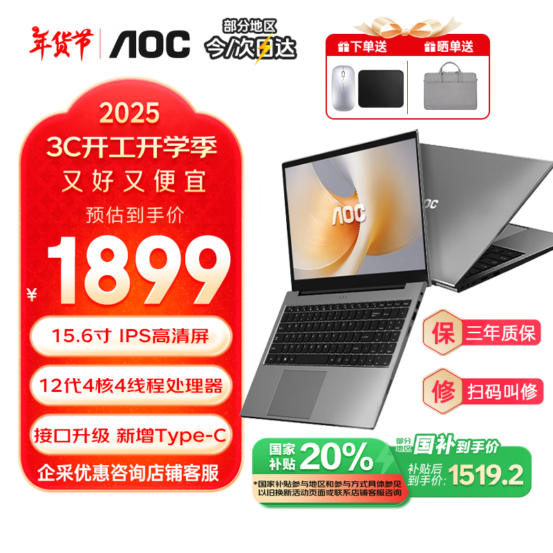 京东AOC 24遇见M156 15英寸高性能轻薄笔记本电脑 1481元