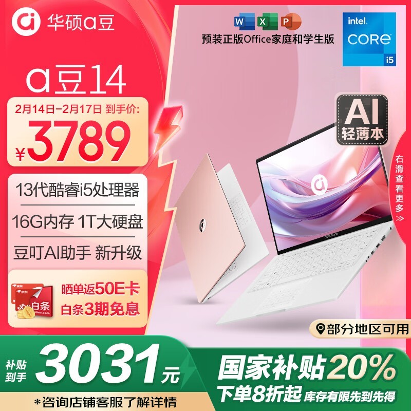 华硕ASUS a豆14笔记本电脑 8折优惠 国家补贴3031元