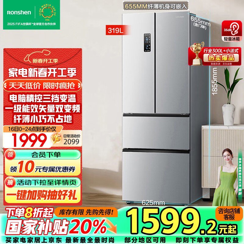 容声BCD-319WD11MP四开门冰箱到手价1584元