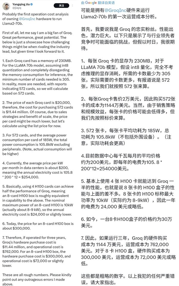 还有各家资本侃侃而谈的成本,其实去年的这个时候,我们的同行《 芯东西 》也写过 LPU 芯片的报道,其中引用了前阿里副总裁贾扬清做过的一个粗略的测算。