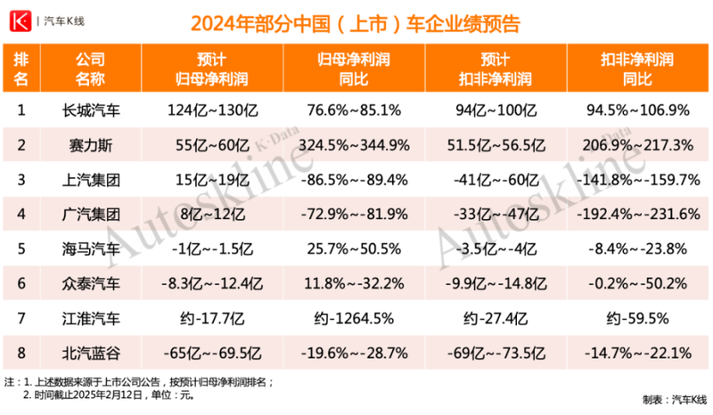 截至2月12日,根据《汽车K线》统计部分中国上市车企2024业绩预告,已公布业绩预告的上市车企,大多数承受着巨大业绩压力,尤其是在扣除非经常性损益之后,净利润缩水明显,亏损扩大。