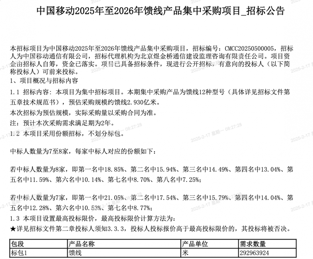 C114讯 2月17日消息(九九)中国移动采购与招标网日前发布2025年至2026年馈线产品集中采购项目招标公告,采购12种型号馈线,采购规模约馈线2.930亿米。预计本次采购需求满足期为2年。