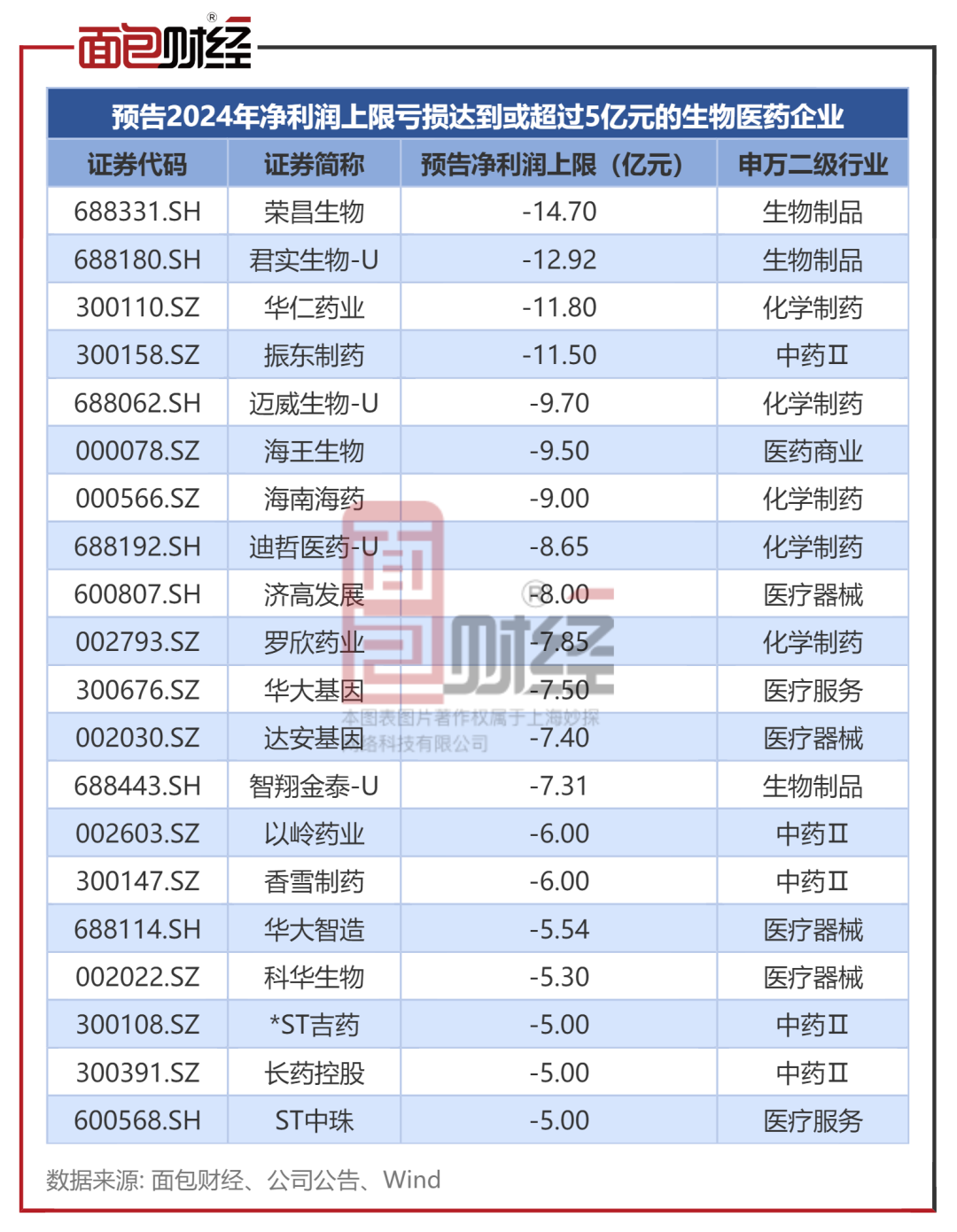 荣昌生物、君实生物-U、华仁药业等20家企业预告2024年净利润上限亏损超过5亿元。