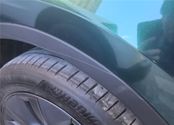 从车主拍摄的视频里可以看到,车上有非常连贯的划痕,在塑料轮眉处格外显眼,好在车子贴有车衣,检查后发现车漆应该无碍。