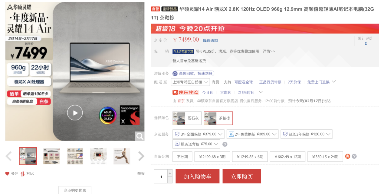 目前华硕灵耀14 Air骁龙版已开售,感兴趣的朋友可以前往各大电商平台了解产品详情。