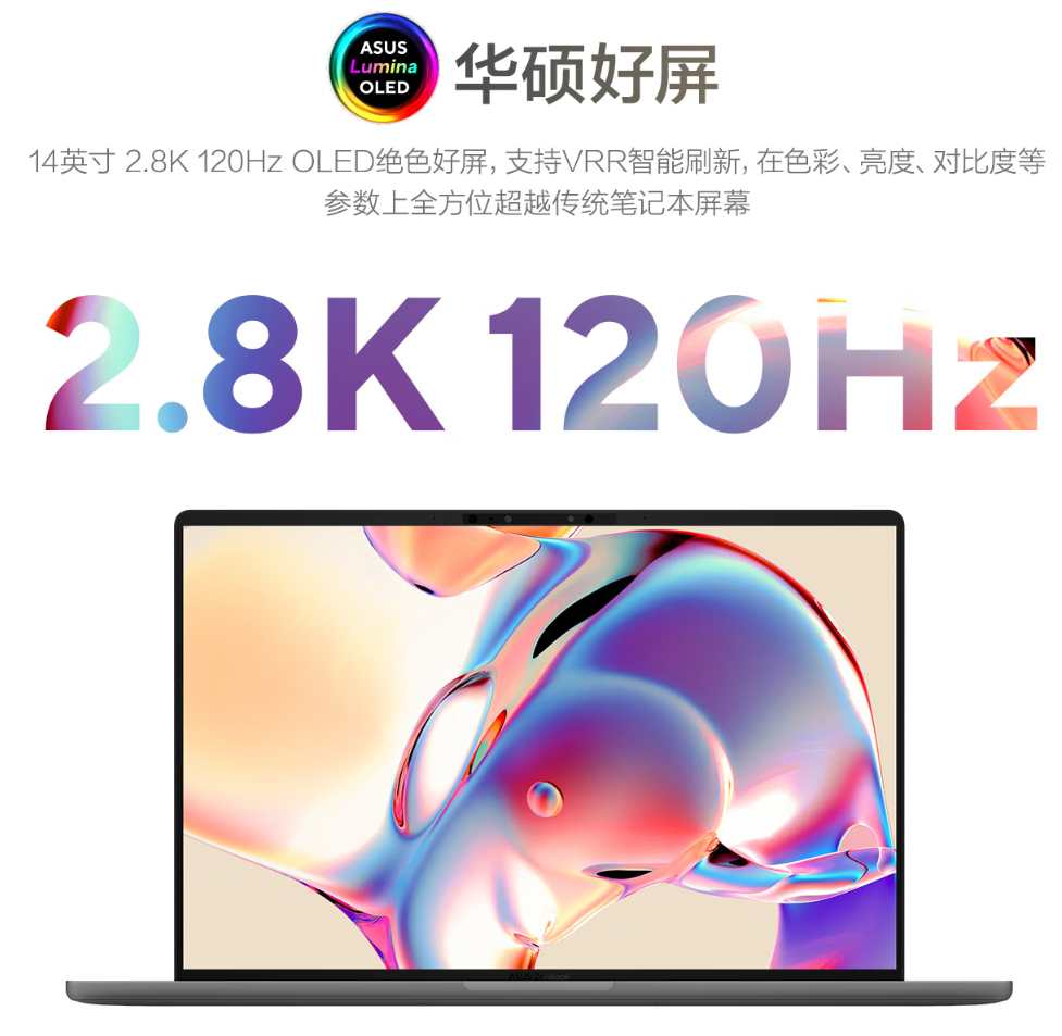 屏幕方面,华硕灵耀14 Air骁龙版采用了一块2.8K 120Hz OLED华硕好屏,视觉效果非常出色。2880x1800的分辨率放在14英寸上,清晰度极佳;120Hz高刷和0.2ms响应时间保证了画面流畅度,并且支持VRR智能刷新,流畅体验的同时也兼顾了续航表现;OLED保证了画面的视觉观感,600尼特高亮度、100% P3广色域覆盖、1000000:1超高对比度、10bit色深和DisplayHDR True Black 600认证呈现出色彩艳丽、层次分明、过渡自然的视觉体验。