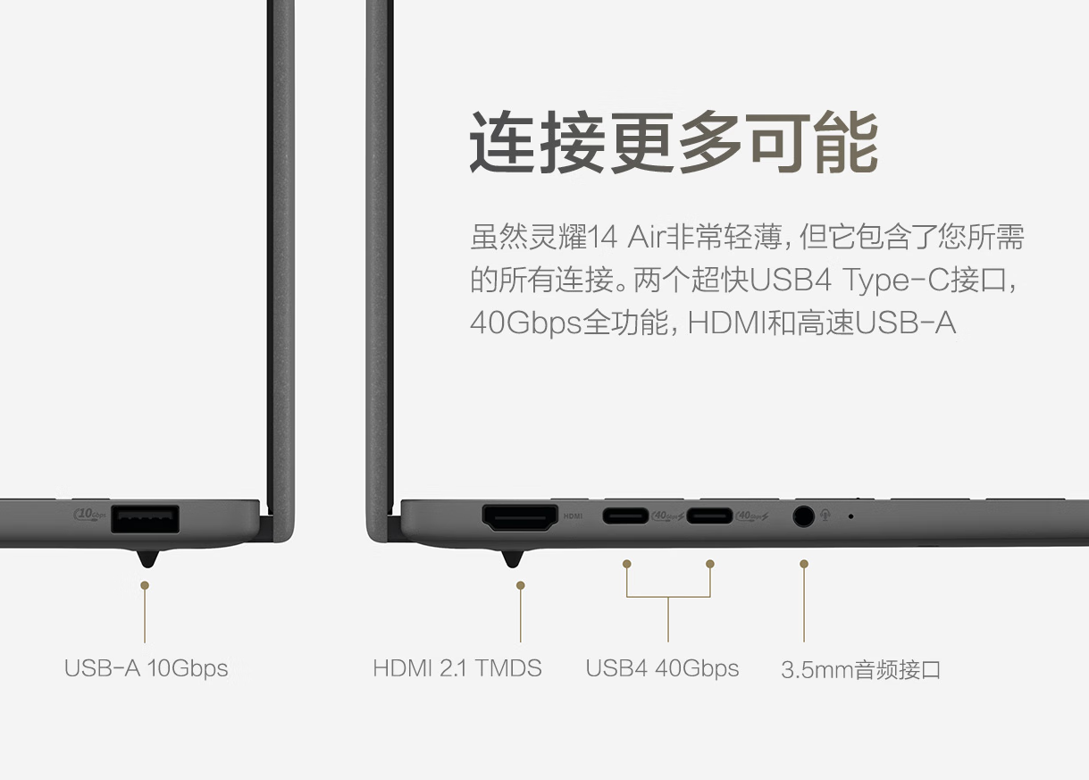 华硕灵耀14 Air骁龙版虽然轻薄,但接口却非常齐全。其提供了两个40Gbps的USB4、10Gbps的USB-A、HDMI2.1 TMDS和3.5mm音频接口,不需要扩展坞也能满足日常使用;华硕灵耀14 Air骁龙版甚至还通过了MIL-STD810H级别严苛测试,包括撞击、振动、高温、低温、高海拔等,可靠性值得信赖。