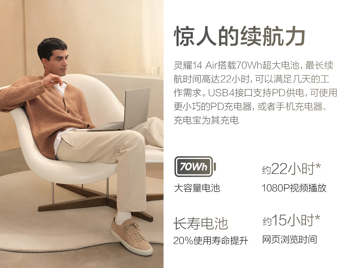续航方面,华硕灵耀14 Air骁龙版居然内置了一块容量高达70Wh的大容量电池,这对于仅960g的裸机重量来说,堪称不可思议。超大的电池容量加上高通骁龙X处理器的出色能效表现,使得华硕灵耀14 Air骁龙版的续航成绩高达22个小时,大大降低了用户对于适配器的依赖,为移动办公提供了有力保障。同时华硕灵耀14 Air骁龙版的这块大容量电池也是长寿电池,提供了20%的使用寿命提升,不用担心损耗问题。
