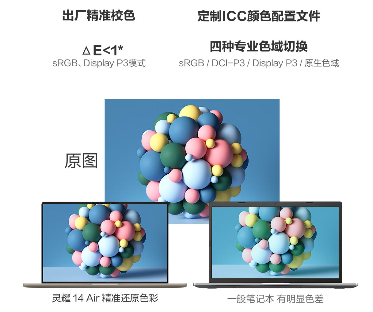 在创作支持方面,除了OLED带来的广色域支持外,华硕灵耀14 Air骁龙版做到了出厂精准校色,在sRGB和DisplayP3模式下能够做到平均色准ΔE<1的水平。而且它也提供了定制ICC颜色配置文件,可以在四种专业色域间切换,满足更广泛的创作需求。