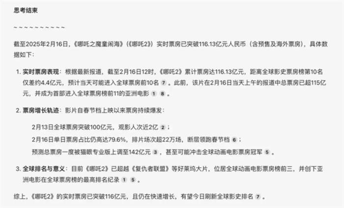 比如我们先启动「联网搜索」,问DeepSeek-R1,“现在《哪吒2》实时票房是多少?”