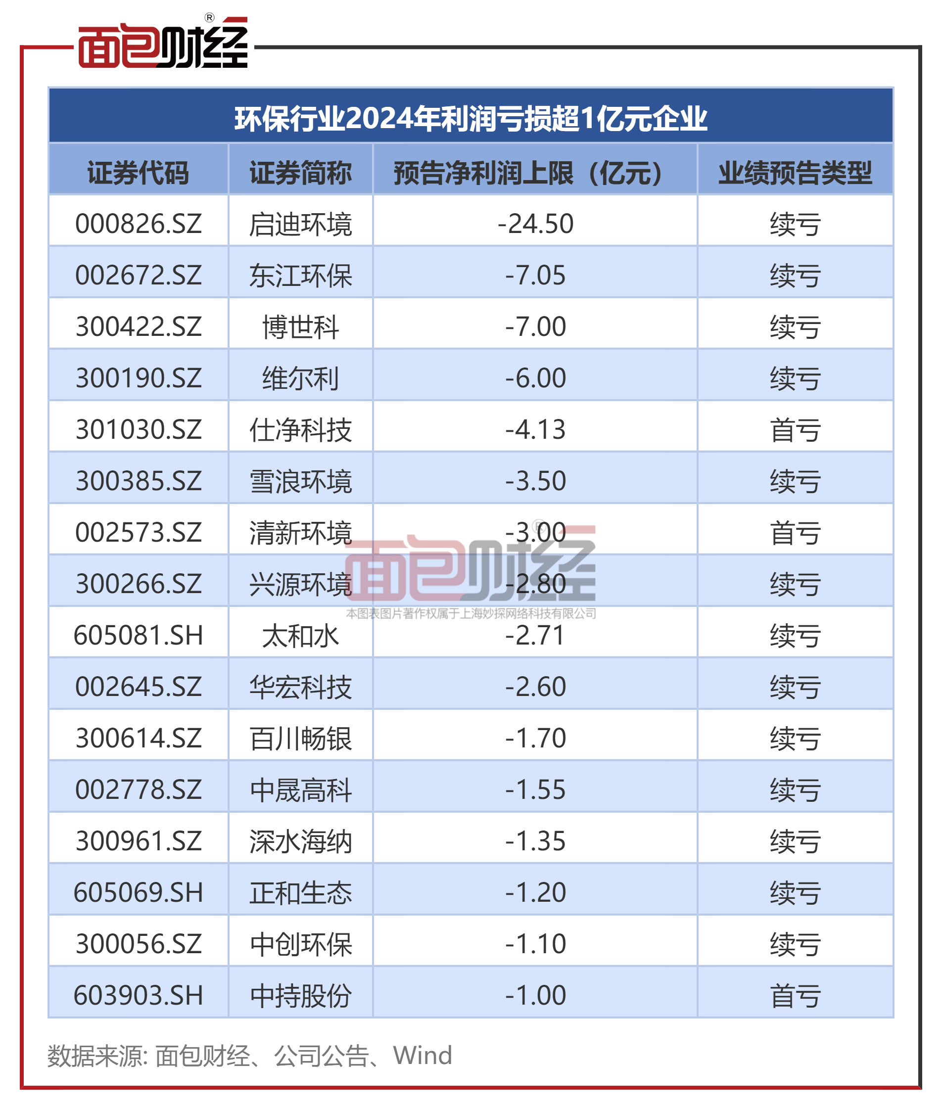 启迪环境、东江环保、博世科、维尔利预告2024年净利润上限亏损超过5亿元。此外,仕净科技、雪浪环境等35家公司出现亏损。
