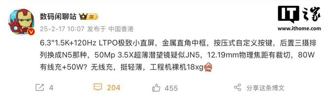 2 月 17 日消息,博主@数码闲聊站 今天公布一款 6.3 英寸神秘新机规格信息,该机将搭载 1.5K 120Hz LTPO 小直屏,配备金属直角中框,按压式自定义按键。