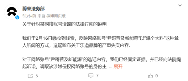 对蔚来公司及包括乐道在内的品牌声誉及用户感情造成持续且严重损害。我们将坚持依法维权,追究策划、制造、传播谣言的相关人员责任。
