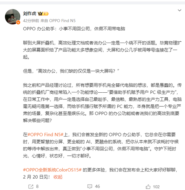 刘作虎表示,在即将发布的OPPO Find N5上,OPPO将首发全新的办公助手功能。该功能将依托更智能的分屏技术、更全面的AI能力以及更融合的系统设计,让你在关键时刻摆脱无谓的等待,真正实现“小事无需回公司,休假无需携电脑”。守护你的下班时光,让心情与状态都保持最佳。关于OPPO全新系统ColorOS 15的更多细节,我们将在2月20日的发布会上与大家深入分享。