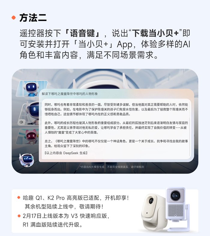 DeepSeek的加入,为哈趣投影带来了全新的体验,它能够根据用户的观看历史、观看偏好等信息,更加精准的推荐个性化内容,还能在观看过程中,进行智能互动,实时回复,同步信息。