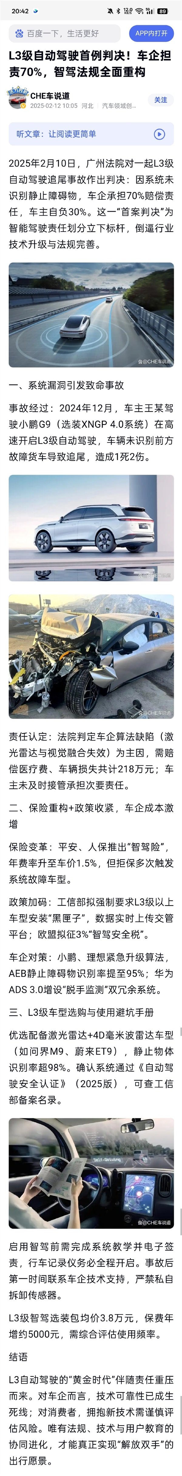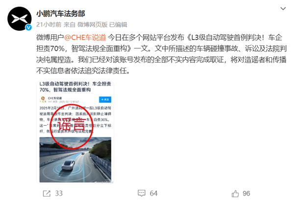 此前报道显示,2月12日,小鹏汽车法务部发文表示,微博用户@CHE车说道 今日在多个网站平台发布《L3级自动驾驶首例判决!车企担责70%,智驾法规全面重构》一文。