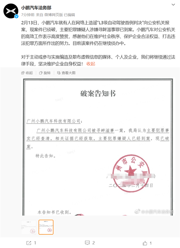 快科技2月17日消息,小鹏汽车法务部今日发文称,2月13日,小鹏汽车就有人在网络上造谣“L3级自动驾驶首例判决”向公安机关报案,现案件已侦破,主要犯罪嫌疑人涉嫌寻衅滋事罪已到案。