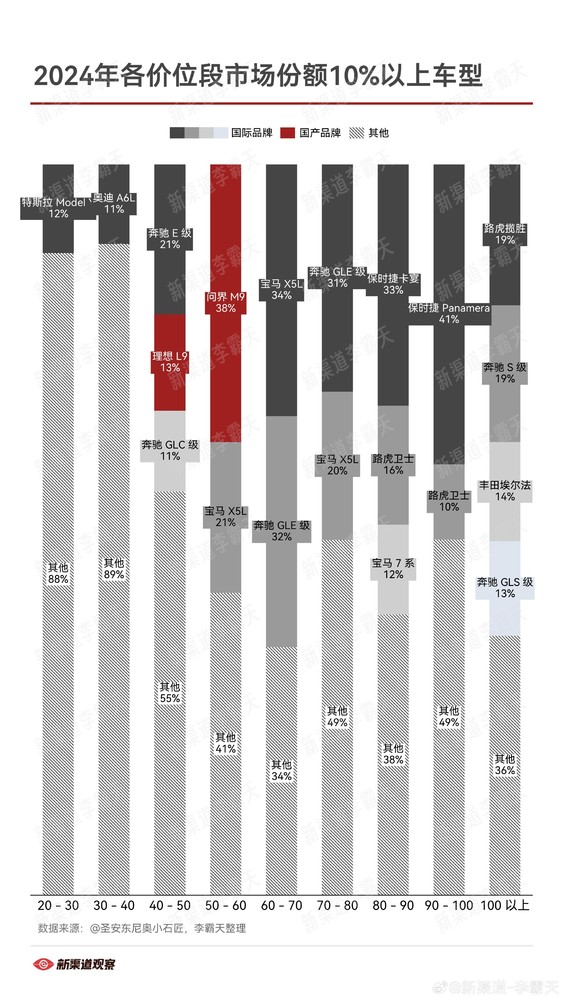 特斯拉Model 3(12%)在这一区间表现突出,显示出中高端新能源车市场的强劲需求。