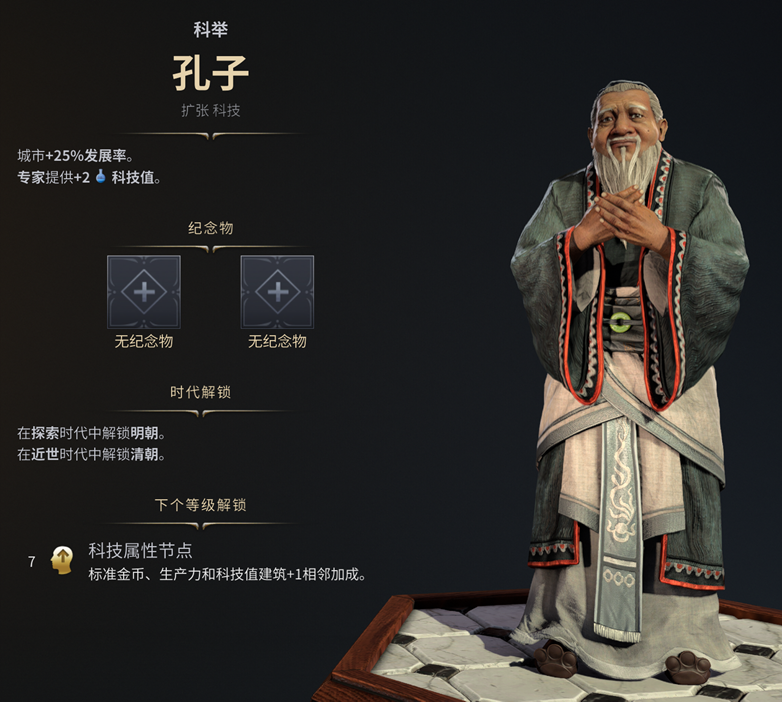 毕竟没有哪个文明不需要人口和科技,所以孔子其实也不必绑死中华文明,他就属于那种朴实无华的万金油领袖,前期后期都有作用,搭配各种文明玩起来都舒服,十分适合新老玩家熟悉游戏机制。
