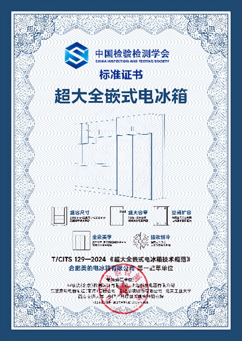 除此之外,美的冰箱也是行业标准的制定者。美的已联合中国检验检测学会制定了《超大全嵌式电冰箱技术规范》,该标准已正式发布,为超大全嵌式冰箱的发展提供技术指导。