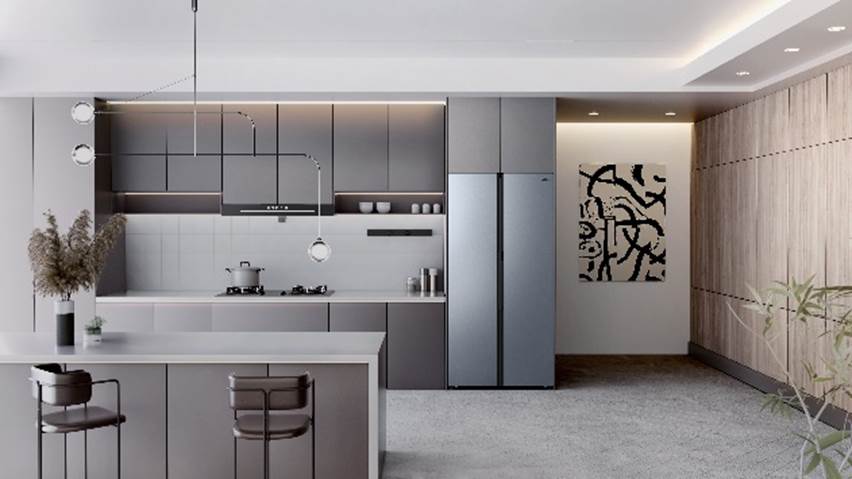 为了实现美学与空间利用的双重突破,美的冰箱研发团队将冰箱宽度设定为992mm,加上两侧各预留4mm,整机仅需1米的预留空间。而目前市面上大多数600L+的非嵌入式对开门冰箱,占地宽度约为1.1米。美的大嵌冰箱的全嵌设计不仅提升了厨房的整体美观度,也使得冰箱能够完美融入各种家居风格。