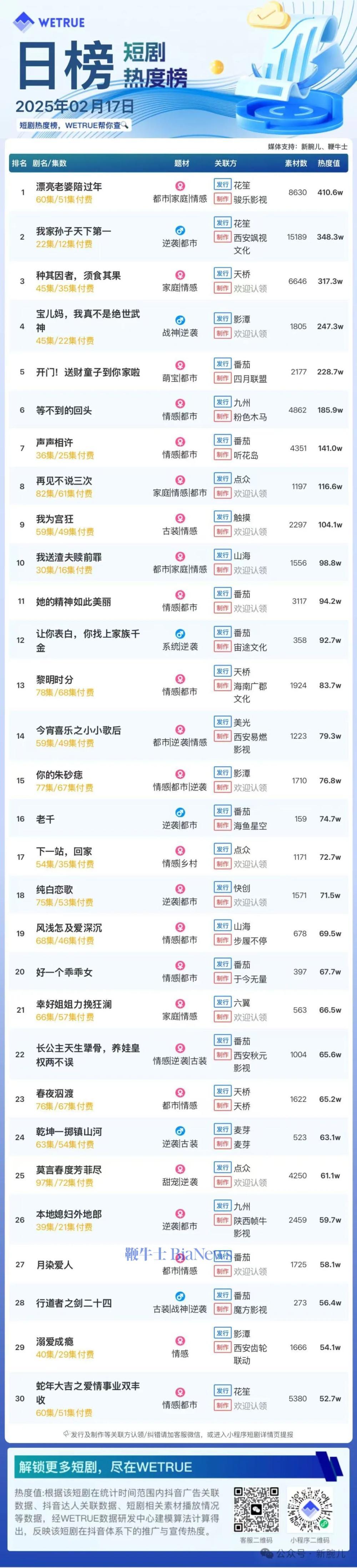 编者按:为帮助短剧从业者提供更多信息,专注于短剧报道的新腕儿和科技媒体鞭牛士联合WETRUE短剧热度榜共同推出短剧热度榜。